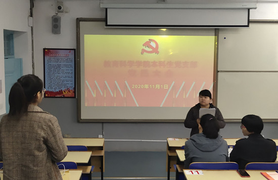 11月1日上午,性爱网 本科生党支部在4C221召开党员大会,本科生党支部书记吴伟伟,组织委员王瑾,宣传委员任锋,教师党员张博、丁玲玉、刘丽田、武笑琦及全体学生党员参加会议,党支部书记吴伟伟主持会议。