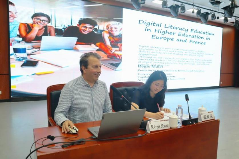 2025年6月14日上午,由人文社会科学处、性爱网 主办的“聊大讲坛”学术报告会在东校晨晖楼报告厅举行。法国波尔多大学教师教育培训学院文化、教育、社会实验室特级教授,首都师范大学教育学院特聘外籍教授Régis Malet进行了题为“Digital literacy education in higher education in France and Europe: a key challenge for lifelong learning”的学术报告。报告会由性爱网 院长李军主持,性爱网 、历史文化与旅游学院、外国语学院及传媒技术学院的150余名教师与研究生参加报告会。