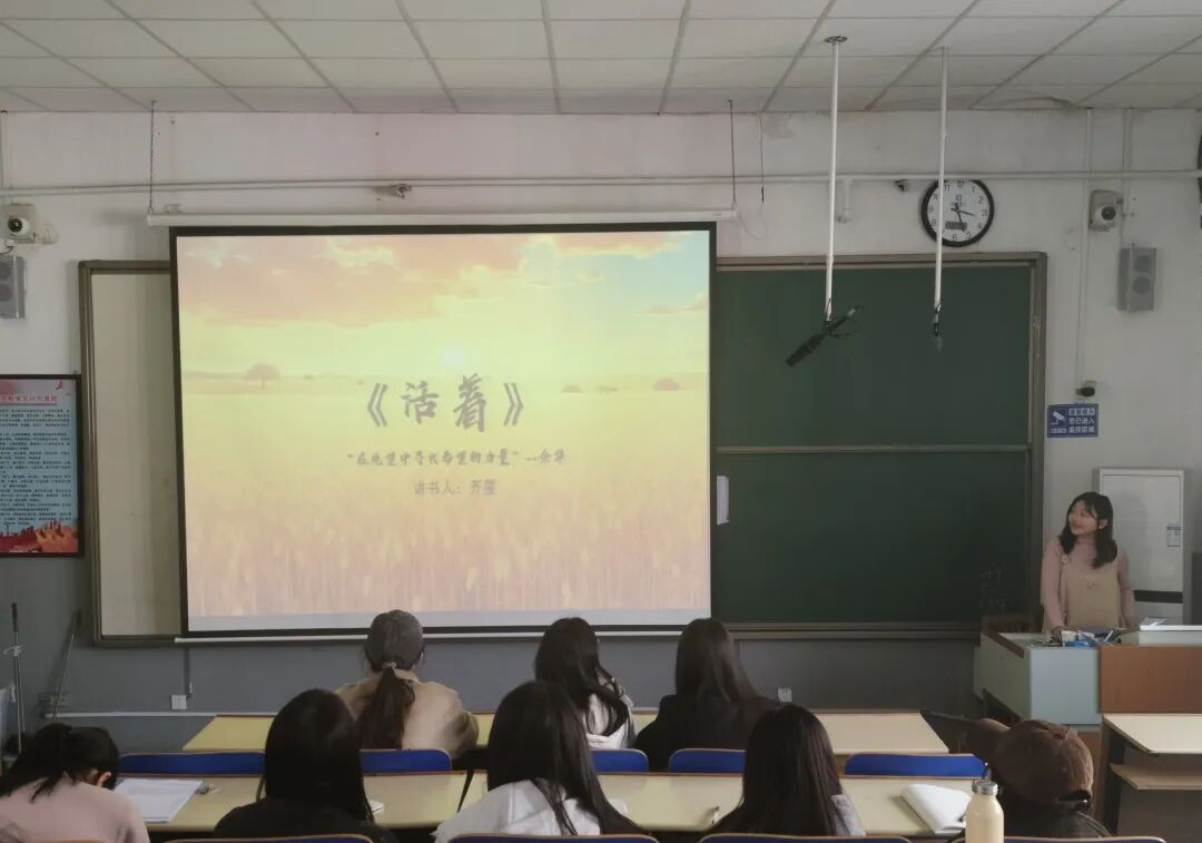 活动中,负责人组织同学们有序入座,参赛者借助PPT分享自己感悟最深最喜欢的经典著作。齐星分享的《活着》展示了生命的坚韧与顽强,引导同学们要勇于面对生活的苦难,珍惜当下的幸福;