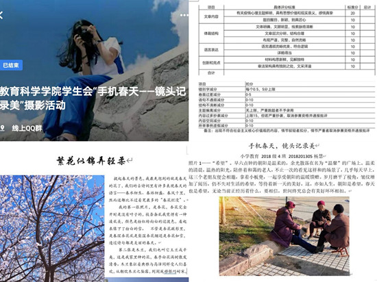 活动前期,负责人对心理部成员进行合理分配并建立相关活动群,保证活动的正常进行。活动要求同学们以镜头的方式来记录春天的美,同学们积极参加,将自己的作品与展示文稿按时上交。在活动过程中,摄影爱好者们用心观察生活,用镜头定格人生的真善美,用相片记录下生机盎然的春天。有的同学以繁花似锦弄轻柔为题材,通过杏花、木棉和月季来展示春天里的生机与热烈;有的同学以希望为题材,通过独特的角度与摄影技巧定格三位老者拿着小板凳,一同闲聊一起享受朝阳的温馨画面;还有的同学以去年的春天为主题,回忆那时春天带来的惊喜,或出去游玩,或记录学校生活,又或是家乡生机勃勃的菜地。同学们通过各种角度拍摄人、事、物各种元素,并加以自身的生动解读,让评委与观众不禁沉醉在多情春天。在观众投票与评委打分后,李文煜同学获得一等奖,杨慧和石继飞同学获得二等奖,于海洋、苏紫怡和祖嘉璇同学获得三等奖,胡鑫烁等五位同学获得优秀奖。