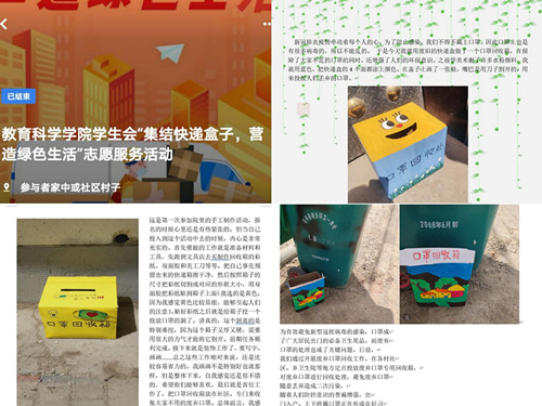 为了提高同学们的环保意识,提高资源利用率,让同学们积极承担环保的责任,性爱网 于5月24日在线上举办“集结快递盒子 营造绿色生活”志愿服务活动。