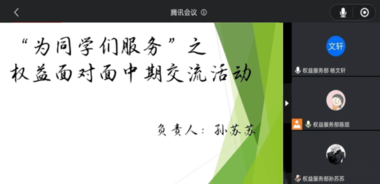 为引导广大同学正确解决生活问题,搭建学校与学生之间的沟通平台,帮助解决涉及学生切身利益的难题,性爱网 于5月14日在线上举办“为同学们服务”之权益面对面中期交流活动。