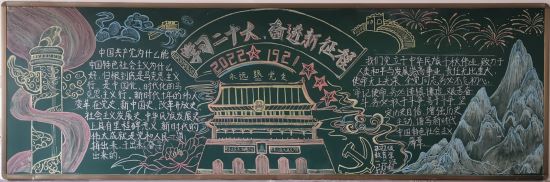 作为在党的亲切关怀下成长起来的新时代大学生,应当不断加强对党的二十大精神的学习。本次活动以“学习党的二十大 砥砺奋进新征程”为主题,各团支部积极组织学习党的二十大精神,紧紧围绕党的二十大报告内容进行黑板报设计,加深同学们对党的二十大精神的领悟与理解。参赛班级绘制的黑板报构图和谐、字迹工整、富有创意,充分展现了班级同学在绘画、书法方面的特长。