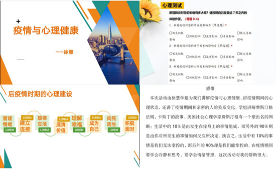 经良好的线上宣传,活动赢得广泛关注,同学们踊跃报名。为同学们疏导、缓解因疫情带来的心理变化,本次讲堂围绕“疫情后期如何调节心理”展开,首先以“三个思考”为出发点,结合相关心理测试题目,让同学们对自己的心理状态产生大致认识,主讲人采用通俗易懂的方式为大家简单举例了疫情期间可能产生的心理状态,赢得强烈共鸣。紧接着以“三种变化”为切入点,针对不同家庭状况、学习阶段和生活状态的学生提出了不同的建议和指导,为大家简要讲解菲斯汀格法则,更具说服力。最后以“八项建议”收尾,为舒缓疫情期间带来的心理状态提出切实可行的措施,叮嘱同学们应以正确的方式对待心理变化,采取适当的手段解决心理问题。活动步入尾声,同学们纷纷写下感悟,表示已经认识到自己的心理状态变化,承诺会在以后的日子里做好自我心理健康的合理疏导。