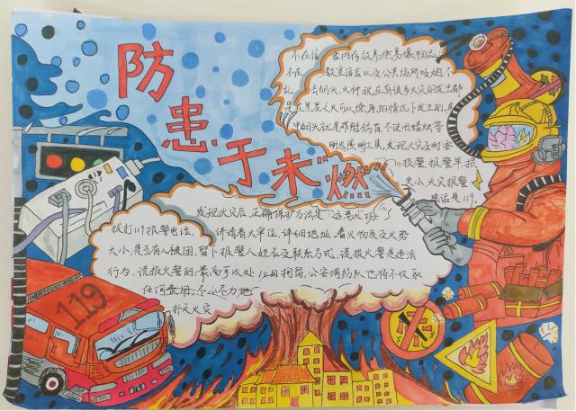 同学们充分发挥自己的想象力与创造力,精心设计绘制了一幅幅色彩鲜艳、内容丰富的手抄报。手抄报内容主要聚焦火灾预防基本常识、火灾应急逃生技巧、消防器材使用方法等,生动的图画,工整的文字,手抄报作品十分精美。还有一些同学们聚焦消防英雄事迹,通过生动形象的绘画描绘了消防员英勇无畏的形象和消防救援场景,作品表达了对消防员英勇无畏精神的敬仰。