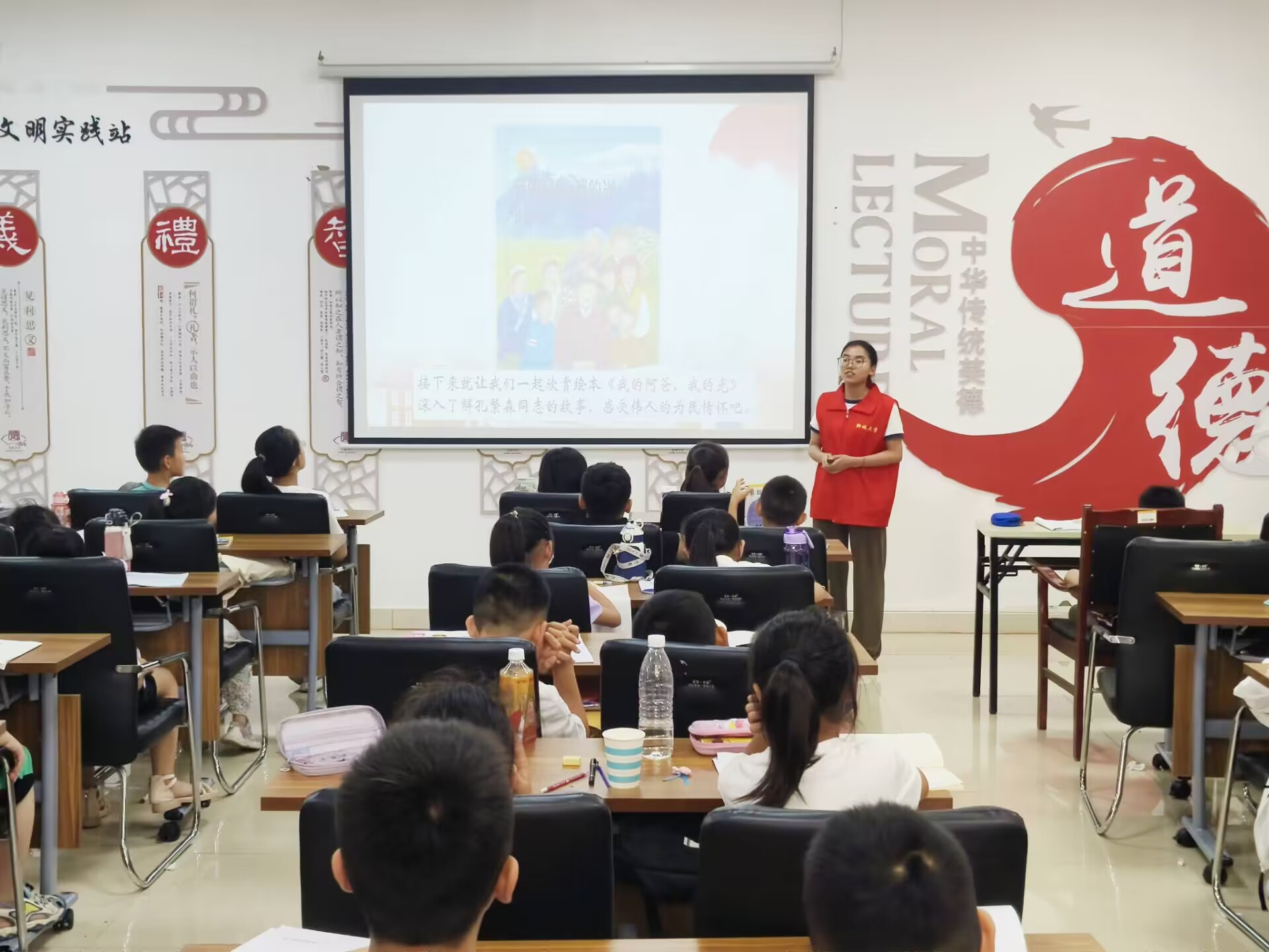 第三站中,服务队成员们来到柳园社区开展了生动丰富的志愿宣讲。志愿者通过讲述绘本《我的阿爸,我的光》,让孩子们了解孔繁森同志的故事,感受孔繁森精神的内涵。随后,志愿者与孩子们积极互动,展开问答环节,孩子们踊跃举手,积极抢答,主动分享自己的见解。宣讲最后,志愿者鼓励每个人铭记像孔繁森这样的英雄,孩子们也纷纷表示要在孔繁森精神中汲取奋进力量,在今后的学习和生活中勇往直前。