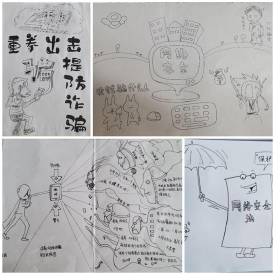 活动期间,参赛选手通过上网搜索或者询问老师同学关于网络诈骗的相关知识,围绕着“远离网络诈骗,安全知识进校园”的主题,根据自己对网络诈骗的了解,进行简笔画的创作。一幅幅画卷题材多样、内容丰富,既有知识性又有艺术性。简笔画主要通过图案来表达“时刻绷紧防范之弦,谨防犯罪”的中心思想。张瑾同学用简单的图案向同学们展示了诈骗的几种方式;许晴同学则用“重拳出击,提防诈骗”几个大字直接警惕同学们提防网络诈骗。