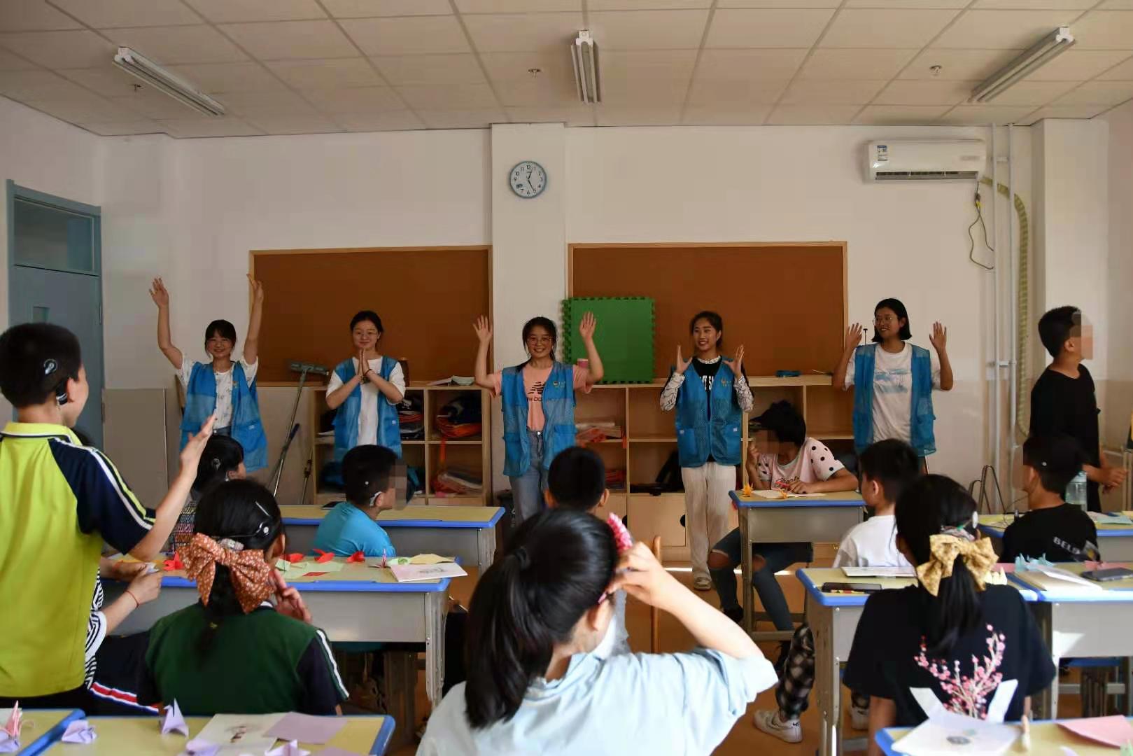 由薛悦姿带领的志愿服务小队在当天下午四点到达活动地点,学校负责人黄老师向志愿者们讲述了该校特殊儿童的基本情况以及志愿服务所需要的注意事项等。九名志愿者刚进到教室中,就被孩子们的热情所感染,向同学们发放了准备的笔记本、中性笔和绘画工具。随后便以一对一、一对多的形式与孩子们进行折纸、绘画、猜谜等游戏,气氛和谐融洽。纸笔搭起了志愿者和孩子们沟通的桥梁,拉近了彼此的距离,消除了最初的陌生感与紧张感,使志愿者们很快与孩子们成为了朋友。志愿者们还带来了舞蹈《快乐的歌》《战豆》以及手语舞《不完美小孩》,陪伴孩子们度过了一个美好的下午。志愿小队为孩子们坚强乐观的品质、纯洁无瑕的心灵而感动,也对长期坚守在特教岗位上默默奉献的老师们表达了崇高的敬意。