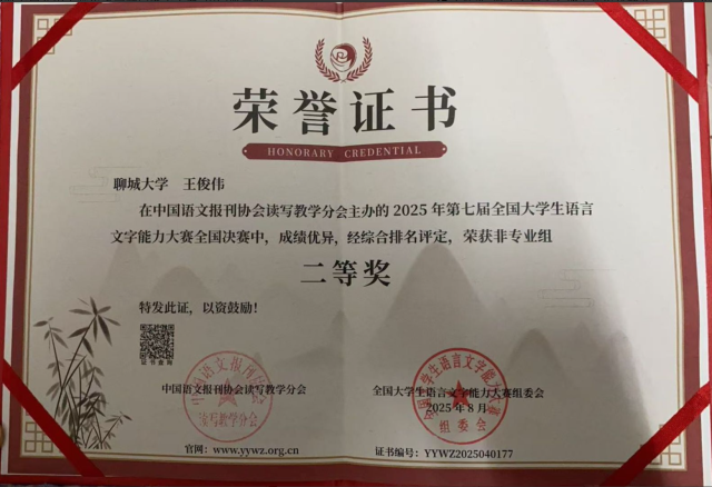 王俊伟 2025届第七届全国大学生语言文字能力大赛 国家级二等奖 2025.08