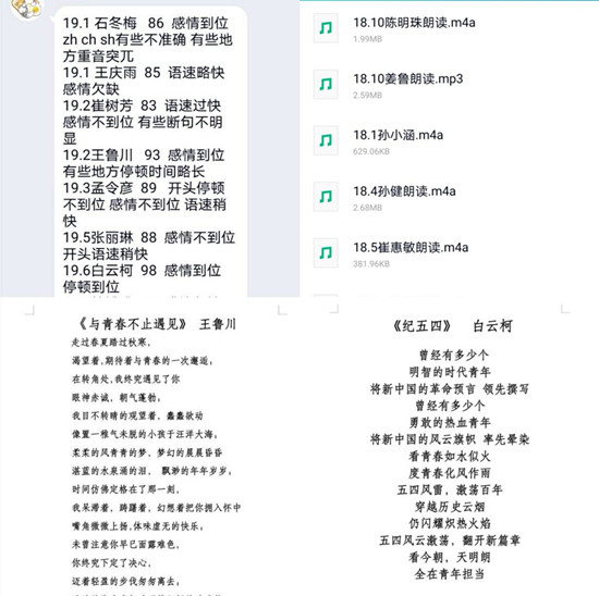 重温红色历程,传承革命精神。本次活动发布后,同学们纷纷报名参加,由班长统计好参加活动的人员名单,报至活动负责人处,并通知报名成功的同学进入共同的qq群。活动开始后同学们积极准备,自由创作诗歌并将诗歌内容录制音频,最后统一发送给负责人。孙健同学将“只耳闻繁华如他起高楼,只听闻光鲜如他宾客”描绘地波澜壮阔,同时也看到了他对“天下风云出我辈”的感叹。孙小涵在她的作品中写到了青年们在五四运动中喊出的“宁可玉碎,勿为瓦全”的铮铮誓言,让人热泪盈眶。石冬梅同学那“外争国权内惩贼,红船扬帆出南湖”的铿锵字句,仿佛把人拉回到了101年前的五四运动时期。崔树芳同学在她的作品中表现出了“恰同学少年、指点江山!”的英雄豪气。最后经过评委们的打分,韩博雅、白云柯、王子强、杨秀丽、石冬梅和王鲁川同学位于前六位。