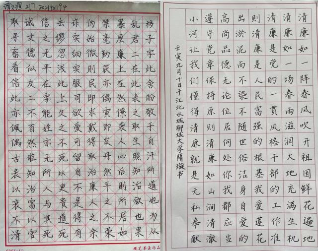 参赛者紧扣廉政主题,以书画、摄影、视频、音乐及舞蹈等形式提交艺术作品。其中,赵佳冉同学的水墨画作品《清正廉洁》,用白纸黑墨描绘了绵延千年的廉洁文化,淡墨氤氲中蕴含着对“廉洁”这一中华优秀传统美德的赞美;隋旋同学用钢笔字作品诠释了自己对“廉洁”的理解,字里行间透露着对中华优秀传统美德的赞扬与歌颂;王金宇同学所作的毛笔字作品,笔酣墨饱,在展现书法魅力的同时,又展示了新时代清廉文化建设的重要性。