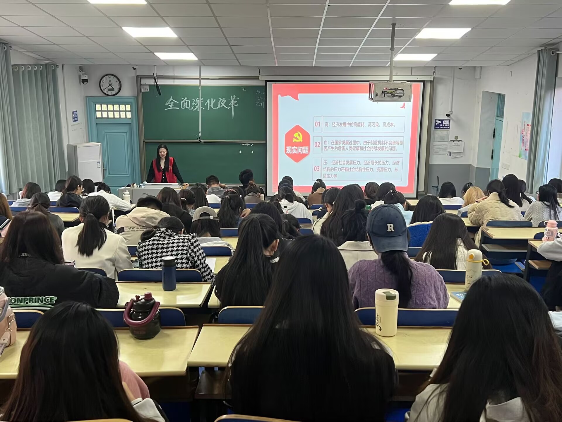本次宣讲会围绕“全面深化改革 谱写中国式现代化崭新篇章”的主题,从什么是全面深化改革、为何坚持全面深化改革、如何推进全面深化改革三方面展开宣讲。活动中,主讲人赵乐文通过视频带大家回顾了中国改革开放四十余载所取得的辉煌成就,使同学们认识到改革开放的重要性。在讲到为何坚持全面深化改革时,她通过一系列数据和事实,生动展现了改革开放后中国在经济、科技、文化等各个领域取得的举世瞩目的成就,突出了坚定不移地实行改革开放政策的必要性。她也从身边实际出发,鼓励同学们不断提高自身素质,永葆爱国初心、砥砺强国之志、实践复兴之行,为社会的发展贡献青春力量。