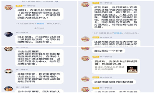 本次活动就同学们在家的学习方法、学习经验展开讨论。活动前期负责人鼓励各班同学积极报名参加,报名成功的同学进入qq群。活动开始后负责人以问题的形式和同学们进行交流,例如同学们在家是如何学习的?在学校宿舍的学习与在家自主学习的区别?学习的环境重要还是自主性更加重要?如何为开学做好准备等。同学们积极踊跃参与,虽不能见面但却感受到了同学们的热情,负责人在同学们回答完问题后都针对回答情况做了总结。接着同学们提出了在学习中遇到的问题,有经验的同学分享解答。最后同学们还在群内分享了自己阅读过的好书,比如与专业有关的《民主主义与教育》《爱弥儿》等,也有同学们拓展阅读的《活着》《四世同堂》等,同学们纷纷说出了推荐理由。活动结束后负责人在qq群里上传了名为《先学会从折被开始》的演讲视频,同学们自由观看。