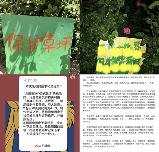 活动准备前期,活动负责人组织相关人员商讨活动流程、注意事项并分配好工作。本次活动主要要求参与者制作有关“保护草坪”的标志牌,尽量用废弃的纸板等,做到废物再利用,同时要求标志牌长宽比例为4:3,制作美观,引人注意。活动期间,同学们带着自己提前做好的标志牌来到附近草坪进行安放固定,同学们的标志牌色彩鲜艳且对比强烈,内容或朴实无华、或和蔼可亲、或幽默得耐人寻味,放在草坪中犹如一股清泉,给人带来清新的慰藉。标志牌固定于草坪后,同学们检查一下周围的环境,捡拾周围的垃圾,为保护环境出一份力。活动后期,同学们写下本次活动的感悟,发于活动群中与大家一起交流,活动负责人对活动进行总结,发放活动积分后,活动结束。