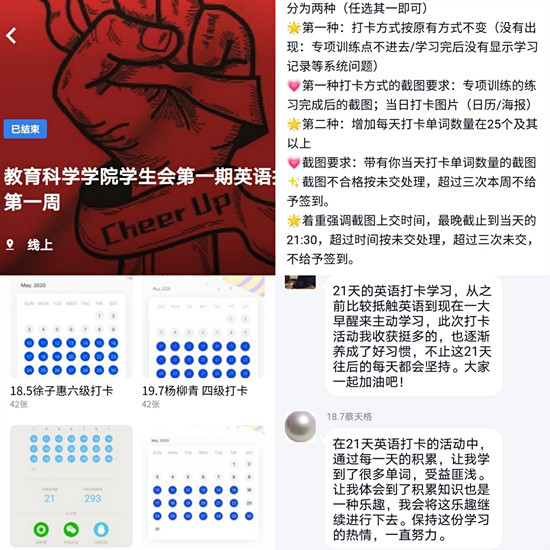 为提高同学们学习英语的积极性,扩充英语词汇储备量,确保线上学习的效率,培养良好的英语学习习惯,性爱网 教科院于5月10日至6月1日在线上举办“英语在手 未来我有”英语打卡活动。