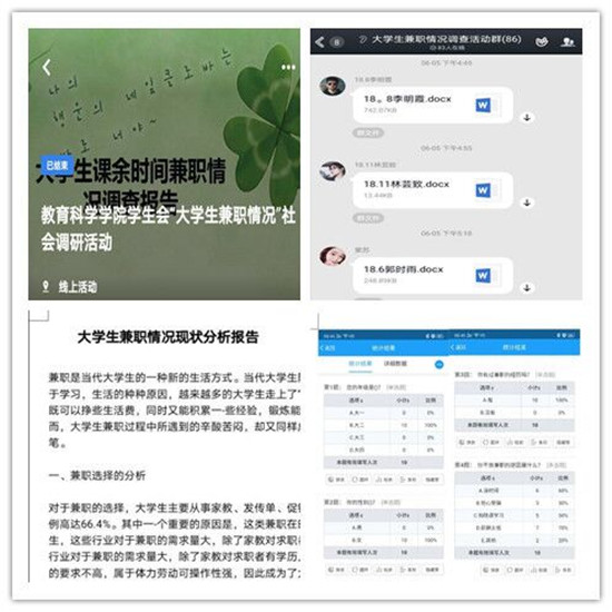 本次活动,鼓励同学们进行有关大学生兼职的社会调查活动,要求参与的同学在调查过后进行整合分析,并根据信息总结出一份调查报告。活动过程中同学们积极参与,踊跃报名,回答问卷的同学也畅所欲言,大胆提出自己对兼职的看法。其中,有的同学在问卷中重点分析同学们的兼职需求,并在调查中发现大学内选择做兼职的同学不在少数,大部分同学希望通过兼职来补贴日常花销,部分同学是希望通过这个渠道找到一份稳定的工作。有的同学深入调查兼职后大学生的感受,发现许多同学提认为兼职可以培养人的韧性,提早适应社会,同时能提高沟通交流能力;还有的同学侧重于统计同学们对于兼职与学习的分配情况,发现同学们更希望将兼职与自身兴趣相融合,渴望兼职能够有益于大学生自身能力的提升。活动后期,参与成员在活动群中进行线上分享活动心得,相关负责人根据同学们的调查总结出社会实践报告,并联系相关人员进行宣传,扩大本次活动的影响力。