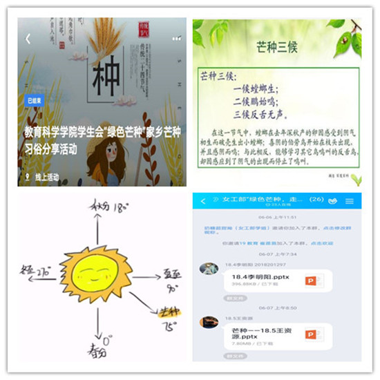 活动前期,活动负责人进行策划申请活动,向各班下发通知并统计各班报名名单,在到梦空间发布活动,同时创建群聊并通知参加活动的同学及时进群。活动要求参加活动的同学以PPT或者vlog的形式展示家乡的芒种习俗,PPT不少于5张并加以介绍,制作vlog时加上字幕进行介绍,不少于2分钟。同学们积极参加,纷纷介绍家乡的习俗。同学们有的用PPT介绍芒种节气的日期和相关习俗,并解释芒种具有“有芒的麦子快收,有芒的稻子可种”的字面意思,将芒种节气与农作物的种植收割联系起来,体现了二十四节气自古以来与农业的密切关系;还有的同学介绍了芒种的三候,即“一候螳螂生,二候鹏始明,三候反舌无声”,将芒种和动物昆虫的关联娓娓道来;也有同学介绍在芒种期间需要注意的饮食养生,注意补水、午休和洗澡,补充水分,保持轻松、愉快的心情,避免中暑。同学们将作品传至群内,进行作品的展示和分享。活动结束,由负责人挑选优秀作品,在“聊大教科”微信公众号进行展示,让大家更加了解各地的芒种习俗。