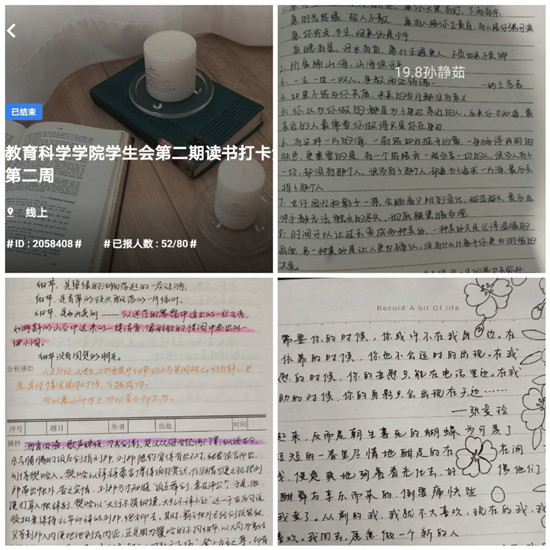 活动前期,由活动负责人制定活动要求与活动内容,并将活动要求发送到各班级中,经过班长与团支书的大力宣传吸引了众多同学报名参加。活动要求同学们将自己读书的画面用视频的形式记录下来,并连续21天将自己的打卡视频发送到活动群中。活动举办过程中同学们积极参与,并在活动群中与同学们交流每日的阅读收获,陈家琪同学在读书笔记中与同学们分享“大行不顾细谨,大礼不辞小让”等古诗词,用短短的几句诗歌向同学们展示中华文化的博大精深;代洪娇同学在读书笔记中摘抄许多富有哲理的对话,让同学们深刻了解努力学习,心怀阳光的重要性。为期21天的阅读打卡活动,同学们不仅收获了书籍中的知识,更重要是学会了保持一颗爱阅读的心灵,同学们将阅读感悟上交到活动群后,负责人核查信息并在到梦空间颁发积分,阅读打卡活动圆满结束。