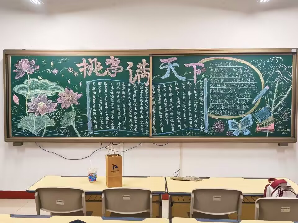 本次比赛得到了同学们的积极响应与热情参与。各班级精心准备,围绕主题搜集资料、设计版面、绘制图案。一幅幅黑板报作品主题鲜明、内容丰富、形式多样,展现了对教育先驱的崇高敬意。在所有的参赛作品中,7班的作品《桃李满天下》尤为引人注目,该作品以荷花与绿竹为设计元素,巧妙地融入了教育家们无私奉献、辛勤耕耘的精神;3班作品《弘扬教育家精神,争做时代先锋》则以教师站在讲台上授课的生动画面,展现了新时代教师们积极投身教育事业、勇于担当社会责任的精神风貌;2班的作品《教育之光,照亮未来》以灯光为设计元素,寓意教育之光能够照亮学生的未来之路,画面中,一盏盏明灯照亮了前方的道路,也照亮了学生们心中的梦想和希望。经评定,7班作品《桃李满天下》获得一等奖,3班作品《弘扬教育家精神,争做时代先锋》获得二等奖,2班作品《教育之光,照亮未来》、4班作品《弘扬教育家精神,建设教育强国》获得三等奖。