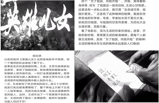 活动准备前期,活动负责人建立群聊,保证活动开展的有效性,采用群视频共享屏幕的方式播放电影《英雄儿女》。该影片改编自巴金的小说《团圆》,围绕着抗美援朝时期志愿军对父子、父女和老战友的感情处理展开。故事情节跌宕起伏,精彩剧情引发同学们去思考什么是英雄精神和怎样去学习英雄精神。影片中王成高喊“向我开炮”后壮烈牺牲,用生命履行了与阵地共存亡的誓言,两位老战友的彼此信任、并肩而战让人对战时情心生敬畏。电影不仅描写了广大志愿军在朝鲜国土上的热血奋斗,体现出革命事业的艰辛历程,更是以细腻的笔触突出了电影主角之间真挚的亲情与雄厚的道德力量,感人肺腑。观影的每位同学都遵守观影礼仪,关闭话筒认真观看。影片结束后同学们抒发个人感想,并将观后感与大家分享,共同探讨,展开了热烈地讨论。同学们纷纷表示,作为新时代青年,应当铭记这段历史,时刻以祖国强盛为己任。