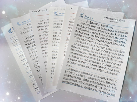 苗心雨清晰秀丽的笔迹,用最朴实无华的情感,呼吁着同学们学习、践行雷锋精神;倪亚男以“螺丝钉”精神为线索展开全文,激起了大家内心的“大爱”;侯鑫通过对雷锋同志的生平介绍,展现了雷锋精神的可贵。经评审,苗心雨获一等奖,倪亚男、侯鑫获二等奖,刘丽莹、王雪和纪卓琳获三等奖。