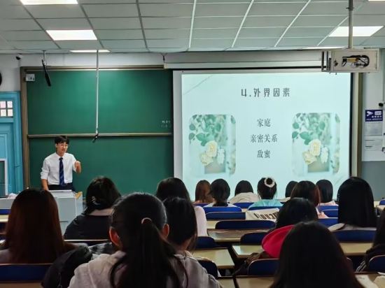 活动中,主讲人王子强首先围绕“如何处理人际关系”和“如何正确对待学习焦虑”两主题开展讲解。他用诙谐幽默的语言向同学们讲述了一个个真实发生的案例,强调了和谐的人际关系在日常生活中的重要性。其次主讲人详细向同学们讲述了“什么是学习焦虑”,并以高中亲身经历为例,告诉同学们缓解学习焦虑的最有效方法是平常在学习上下苦功。同时,他从正反两方面辩证地分析了“人际关系”与“学习焦虑”二者的关系,让同学们认识到良好的人际关系也有助于缓解学习焦虑。