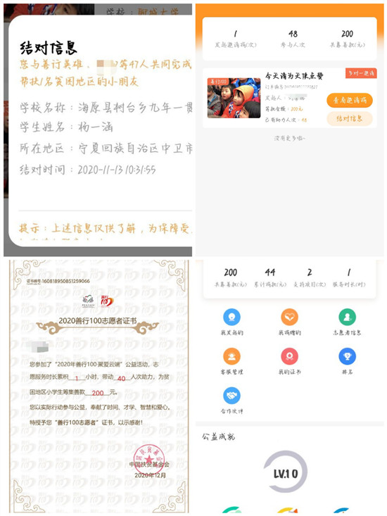 活动伊始,参与活动的志愿者通过扫描微信二维码或微信搜索“善行100”进入小程序,进行志愿者注册。注册完成后,志愿者在自己的各种社交平台上介绍、传播“爱心包裹”项目,邀请爱心人士助力。每一次发起邀请捐存在7天有效期,到期将自动关闭。募捐过程中,志愿者详细地讲解活动的意义和爱心包裹样品,凭借动人的言语打动爱心人士,即使募捐过程中存在着拒绝、无视与误解,也不轻言放弃,坚信付出总有回报。200元募捐目标达成后,中国扶贫基金会将统一派善行英雄会为贫困地区小学生送去温暖包裹。同时志愿者在完成相应善款任务和志愿服务时长后,可获得纸质版志愿者荣誉证书。谢安琪、王悦、罗嘉嘉等同学获得荣誉证书。