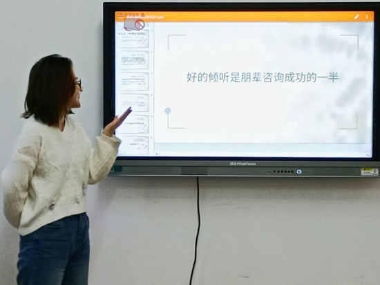 本次培训会以“认识朋辈心理辅导”为主题,主要讲解了朋辈心理辅导的起源和发展、角色定位和基本功能方面的知识。在培训过程中,负责人李雯巧妙采用理论与实践相结合的方式,将专业知识讲解地更加透彻,使朋辈辅导员更加清楚的认识到自身责任与义务。随后,又列举出多个案例,让朋辈辅导员进行练习与实践,大大加深了对本次培训内容的理解程度。除此之外,还通过开展互动问答,让心理辅导员互提问题与困惑,并讨论解决方案,增强了本次培训会的互动性与实用性。