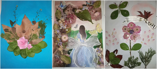张文雅同学的作品,以身着蓝色裙子的女孩为主体,四面环绕漂亮的花朵和叶子,加上珍珠和丝带的点缀,整幅作品展现出春天的生机勃勃;杨凤竹同学的作品以一棵树和刺猬为主体,俏皮可爱,生动鲜活;王睿同学的作品用不同种类的叶子制作成一个花篮,画面立体、生动。经综合评定,张文雅获得此次活动的一等奖,杨凤竹、王睿、迟茹奕获得二等奖,刘雨、赵宗杰、张馨月、马向春获得三等奖。