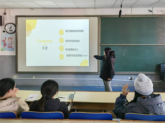 活动过程中,23级各班班长、团支书通过PPT介绍本班的学风品牌,紧紧围绕活动主题分享“作为班委的我们应如何做”“身为大学生的我们应该如何推进优良学风建设”等内容。五班团支书管箫通过分享班级的“自律篇”和“勤学篇”,展示了本班“乐学善行,行而不辍”的学风品牌,她认为班委应当以身作则,发挥带头与服务作用,带动班级形成良好风气;三班班长胡采晴从学习方法、优秀作业和团日活动三个方面展示了本班“多元发展、玉汝于成”的学风品牌;四班班长肖程郅和团支书王梓妍介绍了本班“认真仔细、勤奋刻苦、博学好问”的学风品牌,并提出要树立明确学习目标、培养自主学习习惯等具体措施,推动班级的优良学风建设。