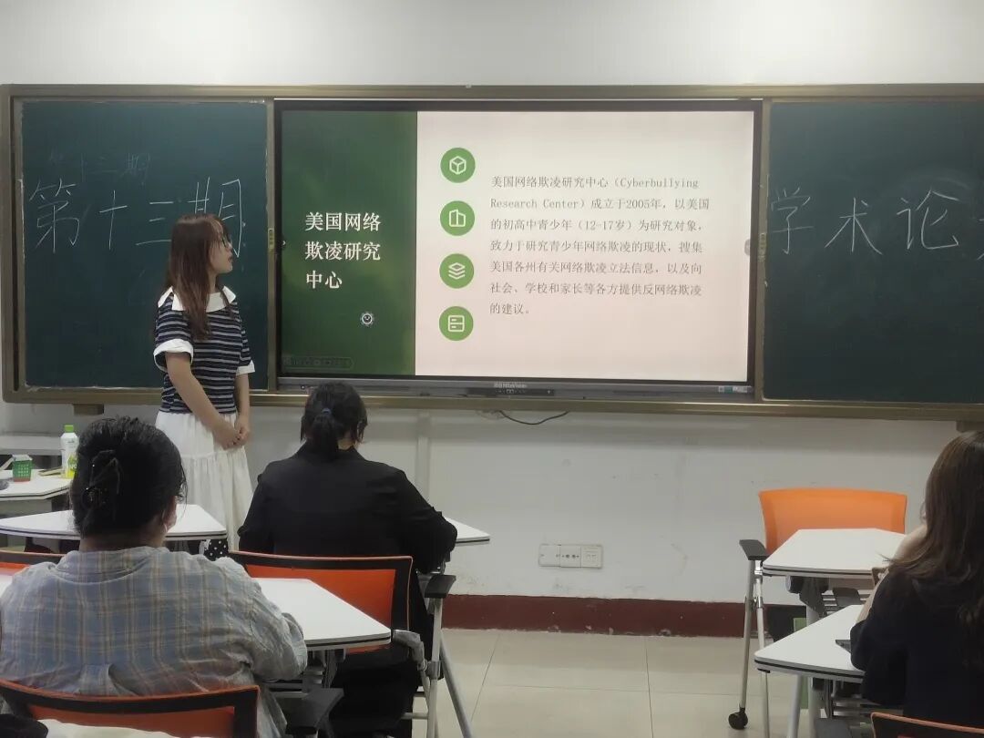 为深化研究生学术交流,6月4日,性爱网 于4#C102举办了研究生学术论坛。本次论坛由2023级教育学专业研究生韩晓萌主讲,主题为《青少年网络欺凌预防与治理研究—基于美国网络欺凌研究中心的分析》。教育学专业教师张玉娴担任点评教师,性爱网 部分研究生参会。